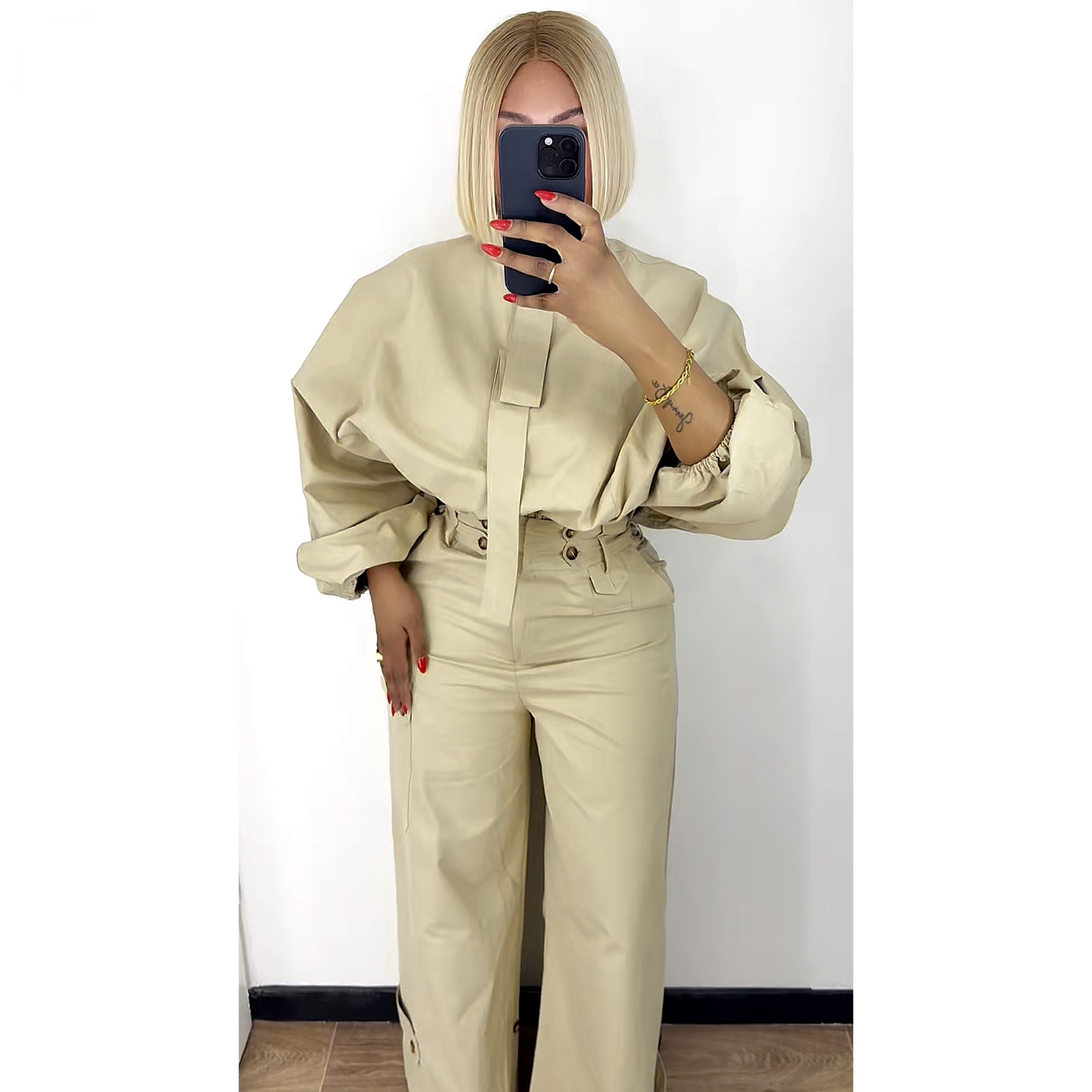 Top manches longues bouffantes avec lacets sur le bas. Boutonnage à l’avant. Pantalon taille haute avec boutonnage à l’avant et sur le bas du pantalon. Poches plaquées.