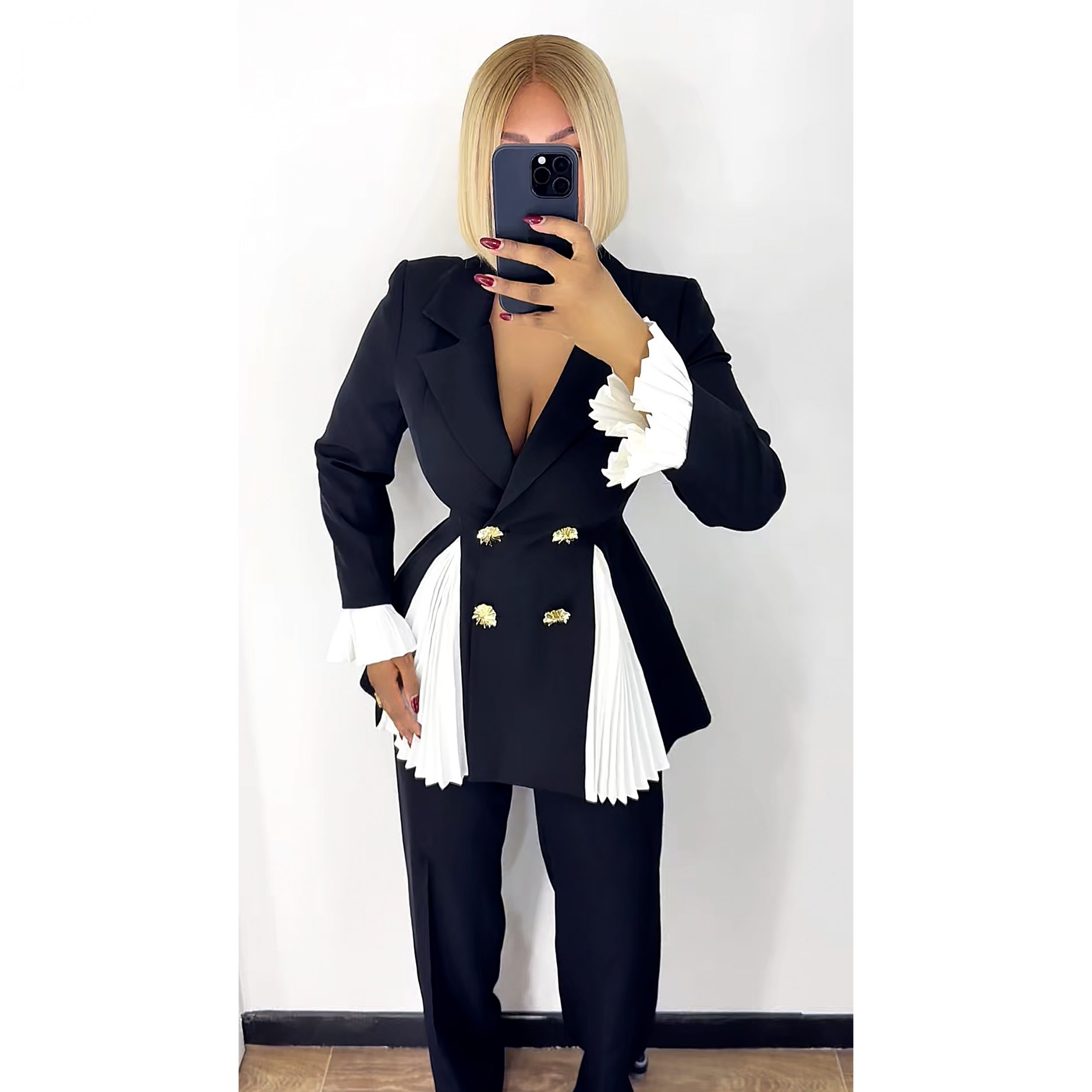 Veste manches longues avec détails plissé sur les manches, avant et l’arrière de la veste. Fermeture par zip à l’avant. Pantalon large taille haute. Fermeture par zip sur le coté.