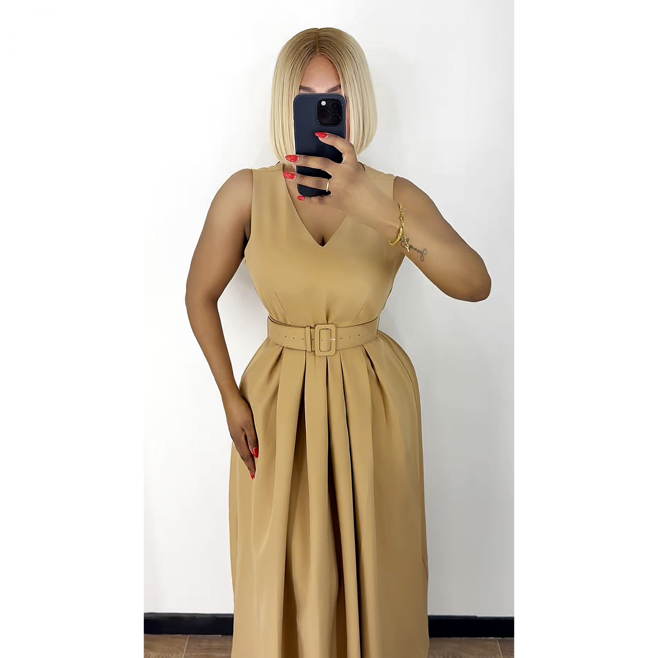 Veste trench courte manches longues. Boutonnage à l’avant. Robe mi longue sans manches. Fermeture par zip à l’arrière. Avec une ceinture.