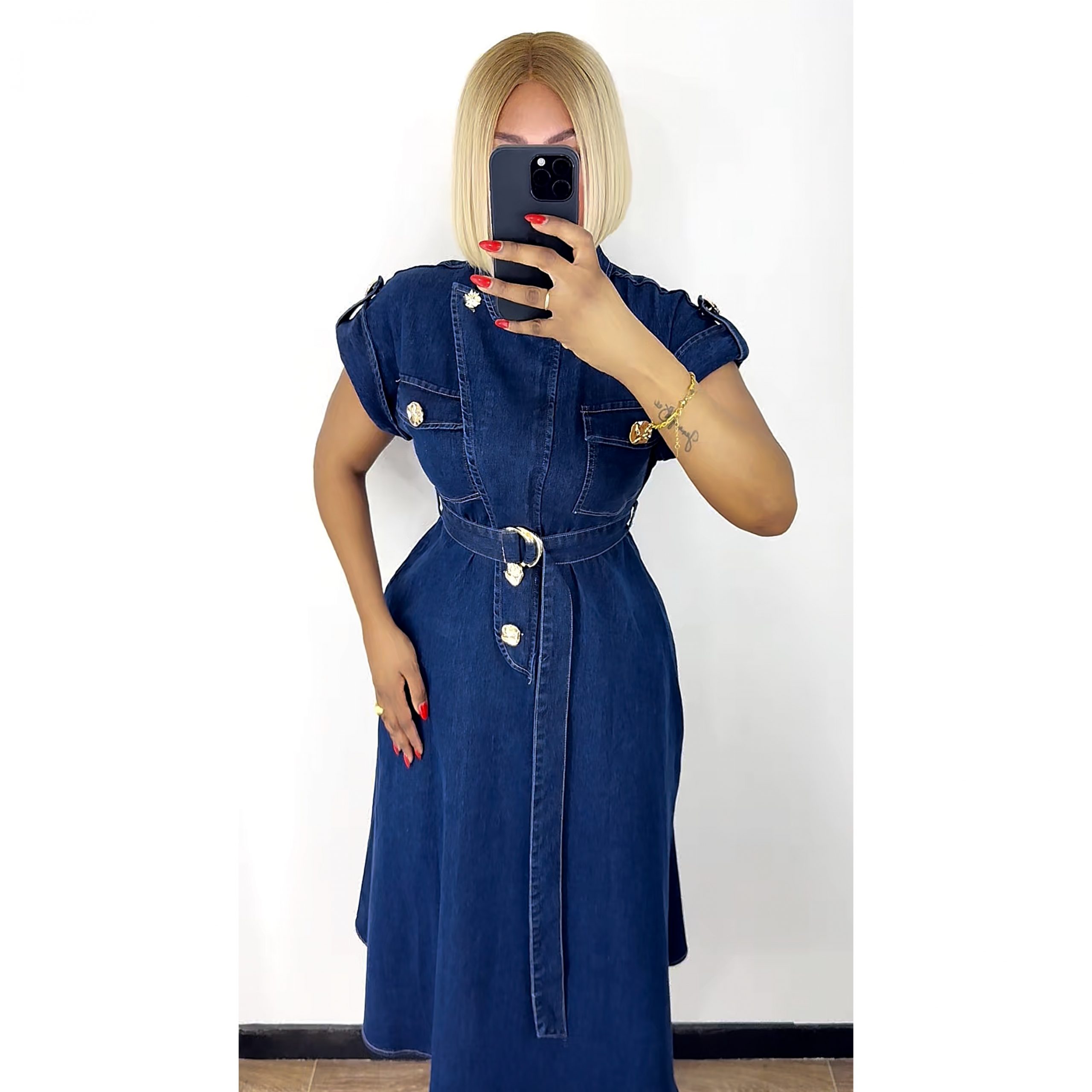 Robe manches courtes avec boutonnages et zip à l’avant. Avec une ceinture, boucle doré.